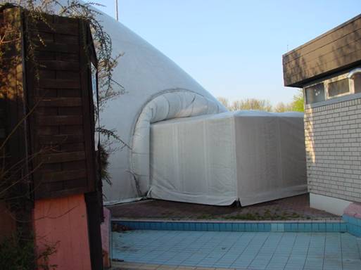 Havuz veya Spor sahası kapama sistemi amacı ile satın alınmış olan şişme yapı, herhangi bir afet durumunda veya ihtiyaç gerektiğinde 1 günden kısa sürede kurulabilecek ve bütün bir mahalle halkını içine alabilecek dev bir afet çadırı veya konser alanı haline gelebilecek şekilde yapılandırılabilmekte ve istenirse dış hava gaz-koku-toz filitrasyonu ile insanları olumsuz hava şartlarından koruyacaktır.
